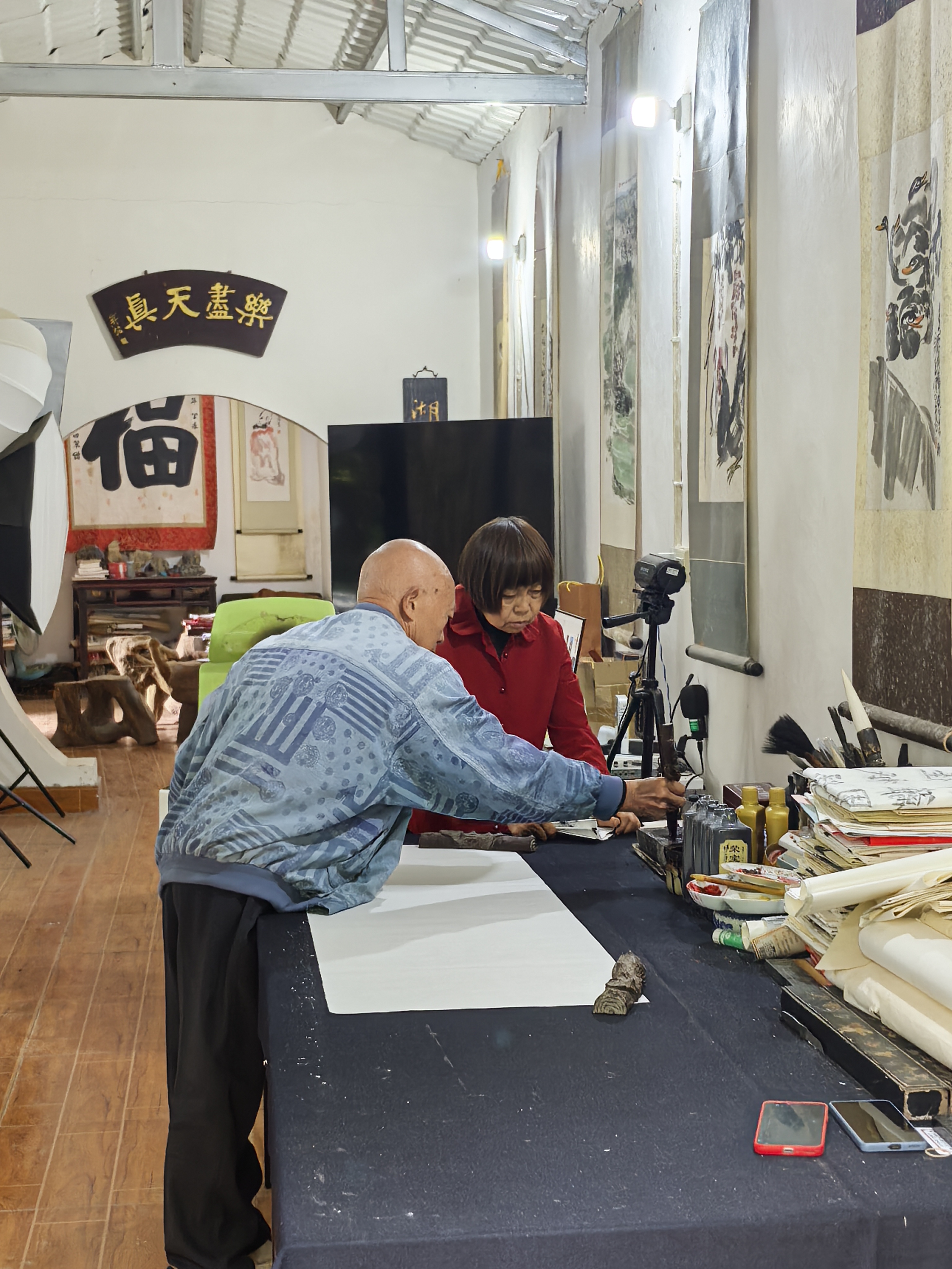 欧阳福写字时,杨琴为他磨墨(闫雯雯 摄)